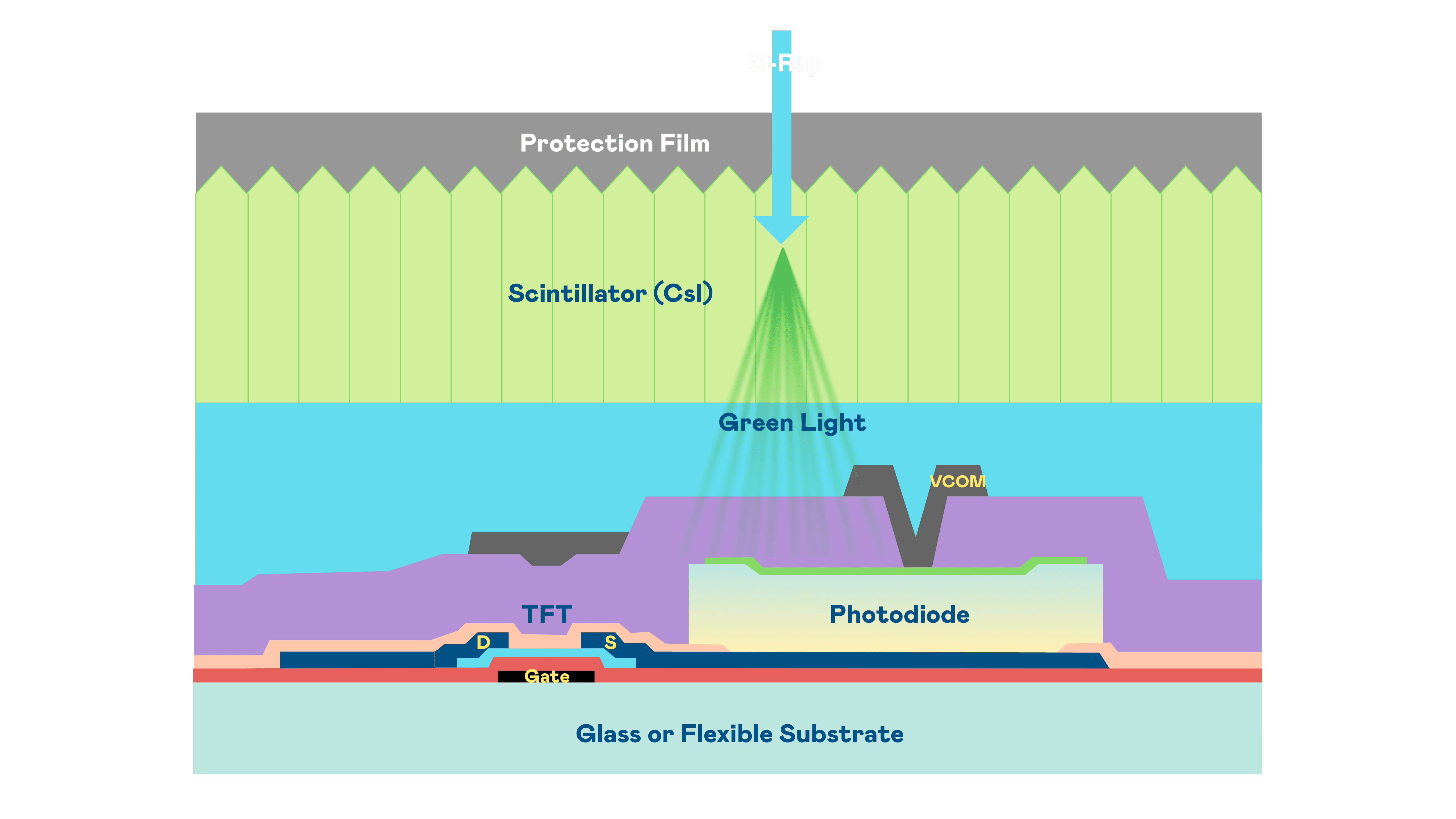 尊龙z6的X光影像感测阵列使用薄膜电晶体 (TFT) 作为每个像素的读取开关,,,搭配光电二极体(Photodiode)的光电转换元件,,用以感测X光影像讯号。。。。