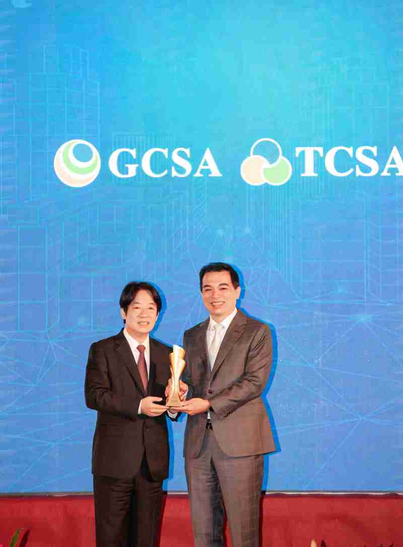 达全方位永续表现获全球永续奖及台湾永续奖肯定,,,由副总统赖清德颁奖 (左),,尊龙z6总经理柯富仁 (右) 代表领奖