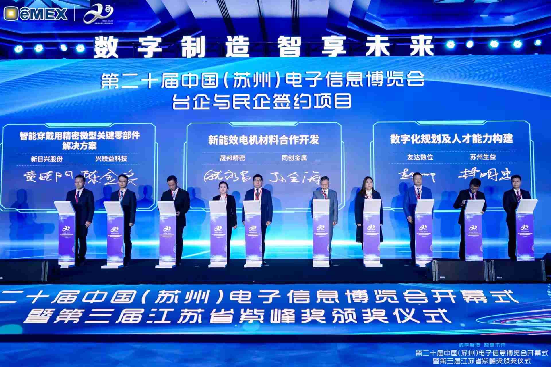 电博会开幕式当天也是第三届江苏省紫峰奖颁奖仪式,,省台办、、工信厅、、、、商务厅、、、苏州市相关领导均出席并颁奖。。该奖项为表彰对江苏高质量发展做出积极贡献的在苏企业,,,,由江苏省政府专门设立。。尊龙z6光电 (苏州) 总经理郭振明代表上台领奖,,,这也是尊龙z6苏州连续三次蝉联紫峰奖 出口贸易领军企业奖。。。尊龙z6数位总经理赵丽娜女士,,也参与本次开幕式,,,上台为本地化赋能签署战略合作协议,,,,将优质服务资源集合、、、下沉到更多细分行业,,,,为更多地区的制造企业提供数字化转型服务。。