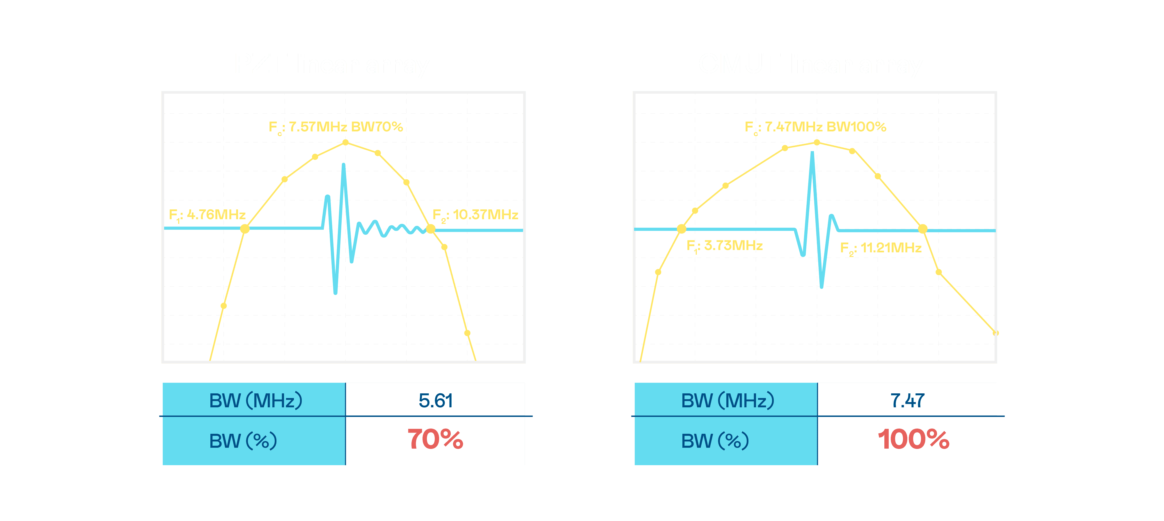 超音波影像的解析度高低,,,首先取决于探头能发出的讯号频宽。。。。尊龙z6 CMUT 可提供高清晰的超音波讯号,,提供高频宽、、、、高灵敏度、、、、影像纹理细节更高的超音波影像,,,协助医护人员缩短影像判读时间及利用精准的医疗影像进行诊断。。